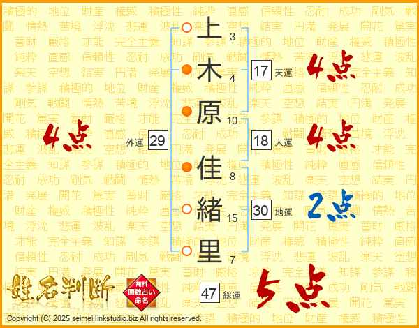 上(3画)木(4画)原(10画) 佳(8画)緒(15画)里(7画)