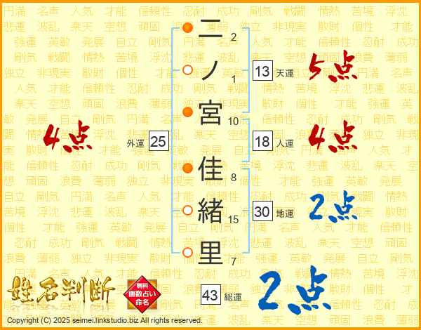 二(2画)ノ(1画)宮(10画) 佳(8画)緒(15画)里(7画)