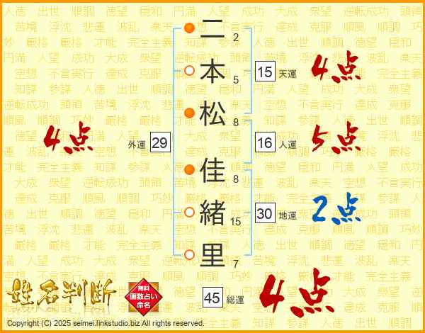 二(2画)本(5画)松(8画) 佳(8画)緒(15画)里(7画)