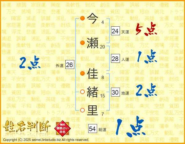 今(4画)瀬(20画) 佳(8画)緒(15画)里(7画)
