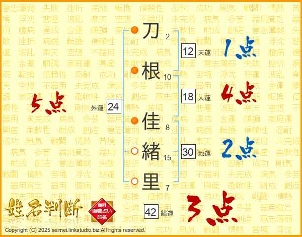 刀(2画)根(10画) 佳(8画)緒(15画)里(7画)