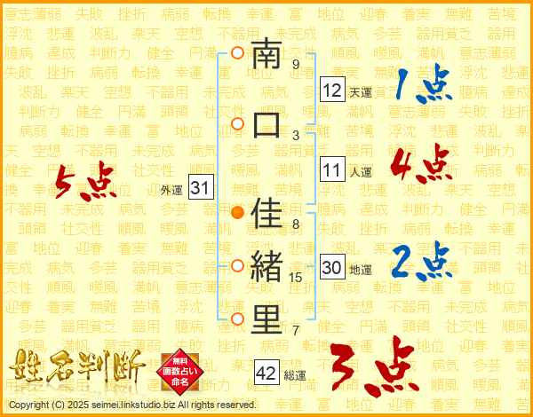 南(9画)口(3画) 佳(8画)緒(15画)里(7画)