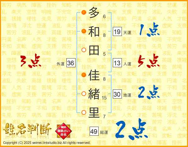 多(6画)和(8画)田(5画) 佳(8画)緒(15画)里(7画)