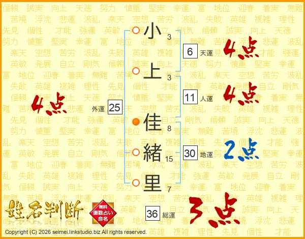 小(3画)上(3画) 佳(8画)緒(15画)里(7画)