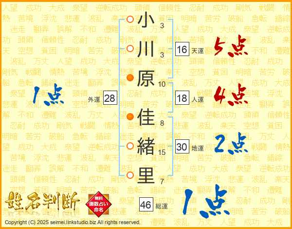 小(3画)川(3画)原(10画) 佳(8画)緒(15画)里(7画)