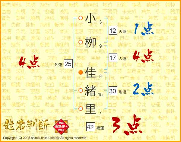 小(3画)栁(9画) 佳(8画)緒(15画)里(7画)