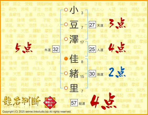 小(3画)豆(7画)澤(17画) 佳(8画)緒(15画)里(7画)