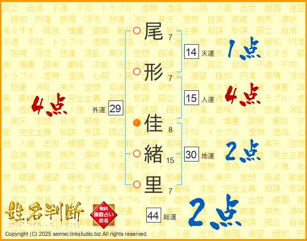 尾(7画)形(7画) 佳(8画)緒(15画)里(7画)
