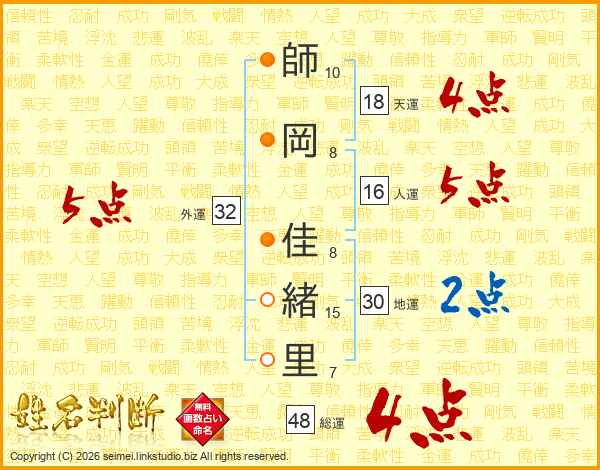 師(10画)岡(8画) 佳(8画)緒(15画)里(7画)