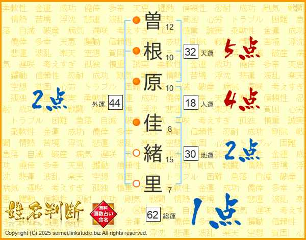 曽(12画)根(10画)原(10画) 佳(8画)緒(15画)里(7画)