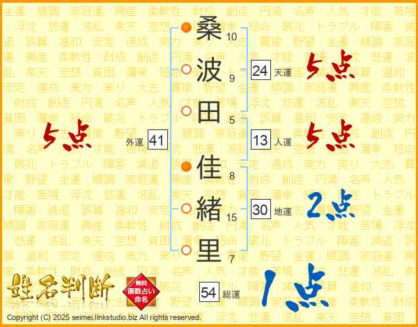 桑(10画)波(9画)田(5画) 佳(8画)緒(15画)里(7画)
