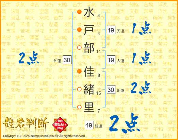 水(4画)戸(4画)部(11画) 佳(8画)緒(15画)里(7画)