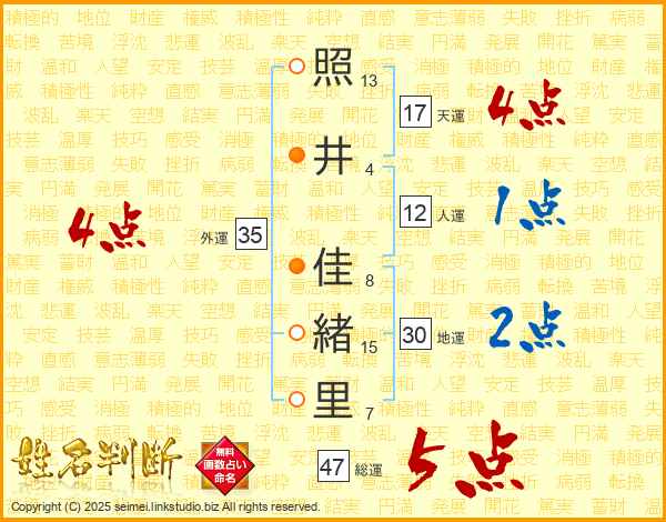 照(13画)井(4画) 佳(8画)緒(15画)里(7画)