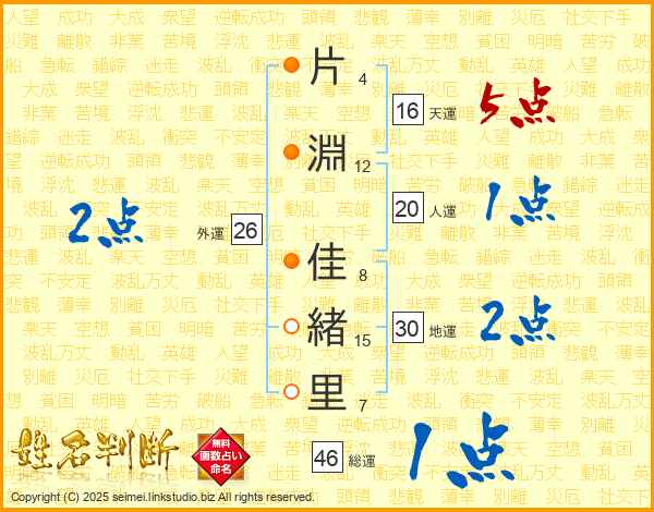 片(4画)淵(12画) 佳(8画)緒(15画)里(7画)