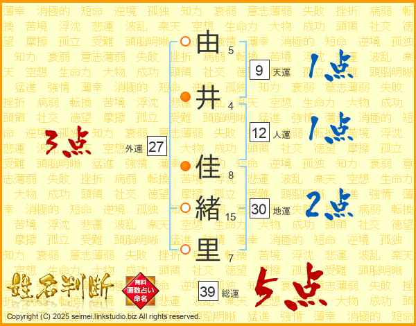 由(5画)井(4画) 佳(8画)緒(15画)里(7画)