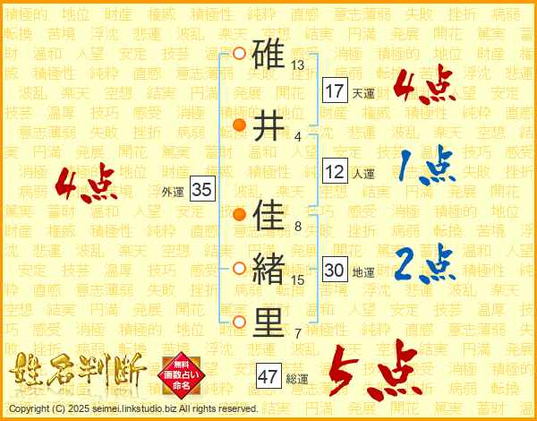 碓(13画)井(4画) 佳(8画)緒(15画)里(7画)