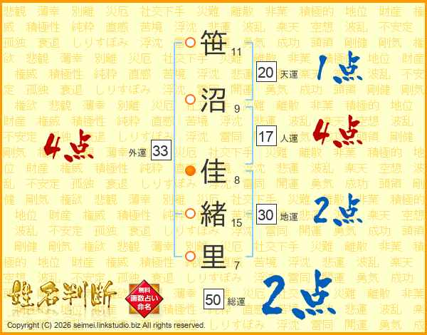 笹(11画)沼(9画) 佳(8画)緒(15画)里(7画)