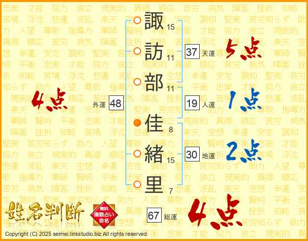 諏(15画)訪(11画)部(11画) 佳(8画)緒(15画)里(7画)