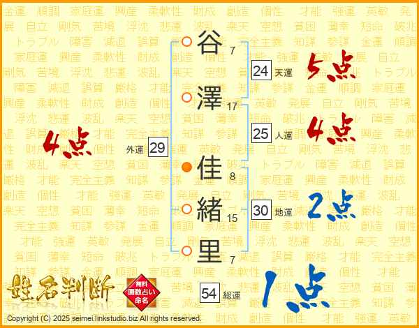 谷(7画)澤(17画) 佳(8画)緒(15画)里(7画)