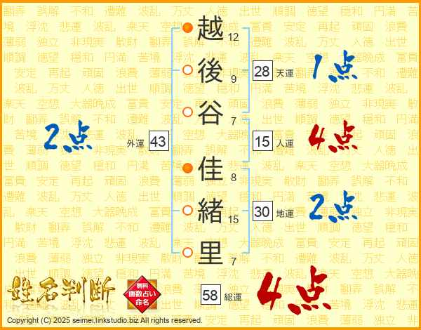 越後谷佳緒里さんの総運は58画の4点!
