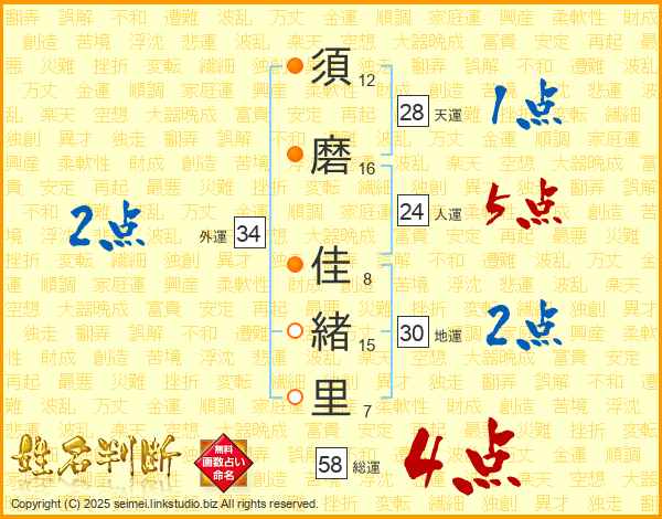 須(12画)磨(16画) 佳(8画)緒(15画)里(7画)