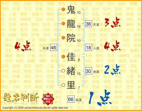 鬼(10画)龍(16画)院(10画) 佳(8画)緒(15画)里(7画)