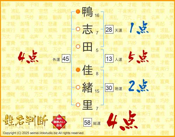 鴨(16画)志(7画)田(5画) 佳(8画)緒(15画)里(7画)