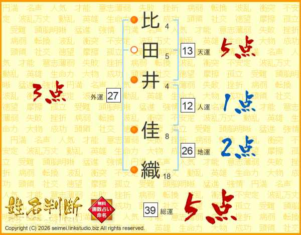 比(4画)田(5画)井(4画) 佳(8画)織(18画)