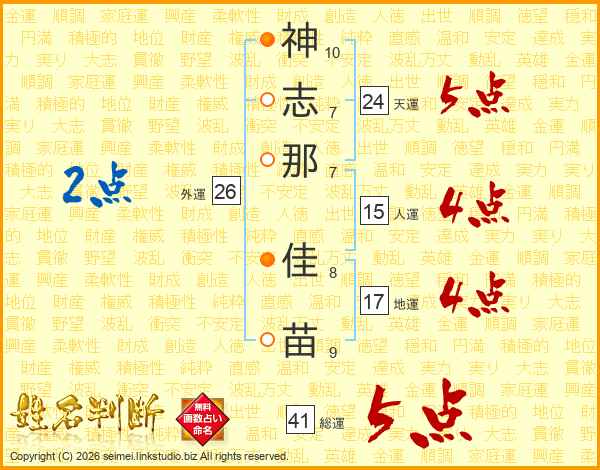 神(10画)志(7画)那(7画) 佳(8画)苗(9画)
