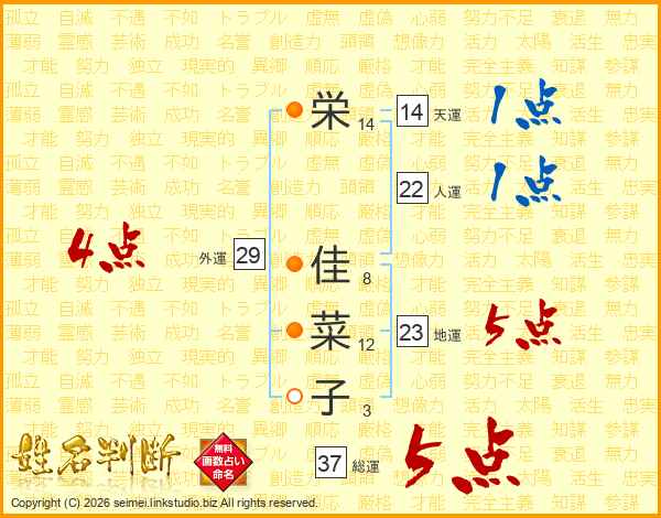 栄佳菜子さんの総運は37画の5点!