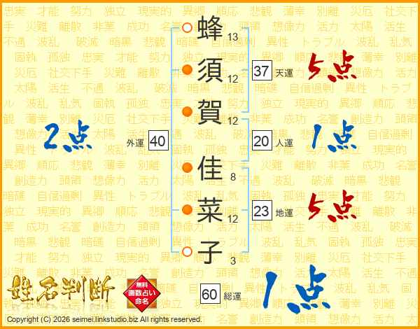 蜂須賀佳菜子さんの天運は37画の5点!