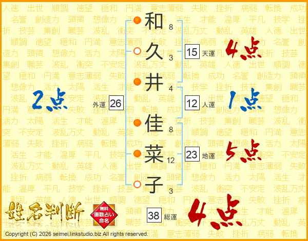 和(8画)久(3画)井(4画) 佳(8画)菜(12画)子(3画)