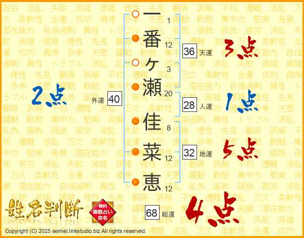 一番ヶ瀬佳菜恵さんの総運は68画の4点!