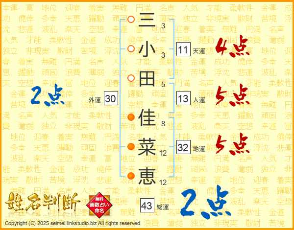 三(3画)小(3画)田(5画) 佳(8画)菜(12画)恵(12画)