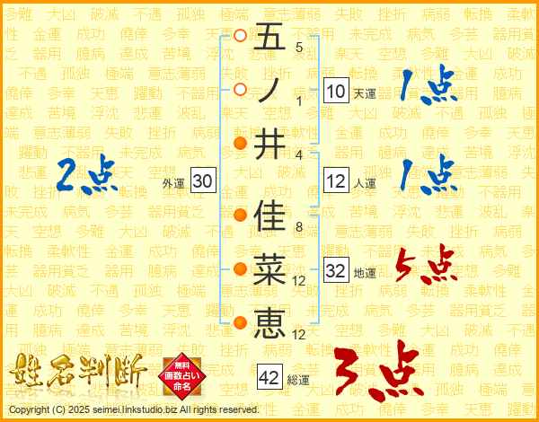 五(5画)ノ(1画)井(4画) 佳(8画)菜(12画)恵(12画)