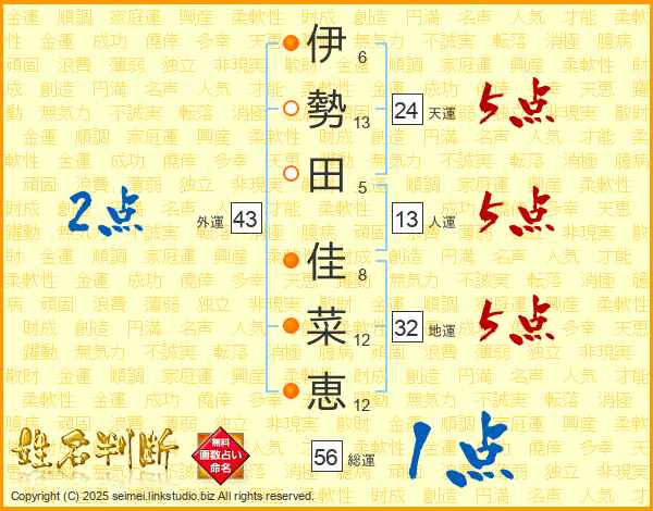伊(6画)勢(13画)田(5画) 佳(8画)菜(12画)恵(12画)