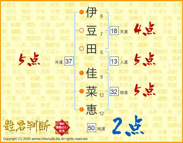 伊豆田佳菜恵さんの外運は37画の5点!