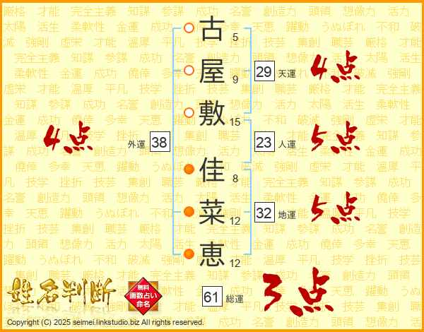 古(5画)屋(9画)敷(15画) 佳(8画)菜(12画)恵(12画)