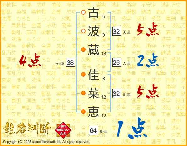 古(5画)波(9画)蔵(18画) 佳(8画)菜(12画)恵(12画)