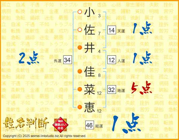 小(3画)佐(7画)井(4画) 佳(8画)菜(12画)恵(12画)