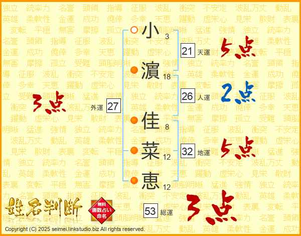 小(3画)濵(18画) 佳(8画)菜(12画)恵(12画)