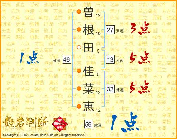 曽(12画)根(10画)田(5画) 佳(8画)菜(12画)恵(12画)