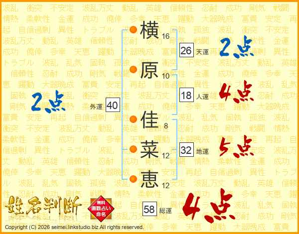 横原佳菜恵さんの総運は58画の4点!