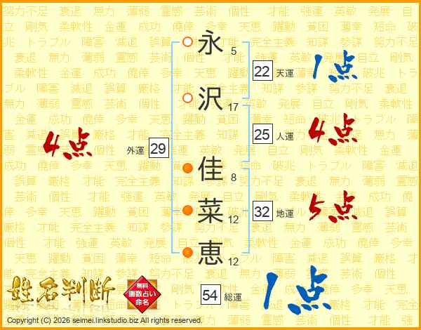 永(5画)沢(17画) 佳(8画)菜(12画)恵(12画)