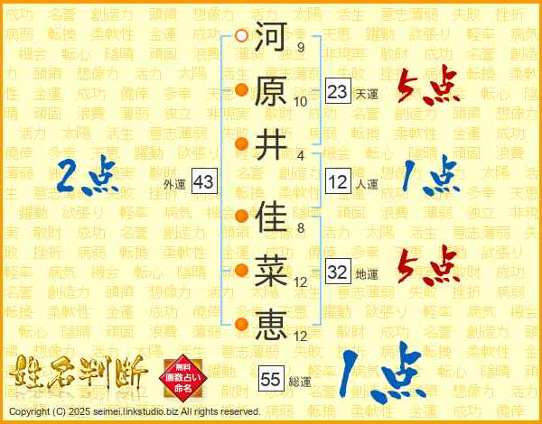 河(9画)原(10画)井(4画) 佳(8画)菜(12画)恵(12画)