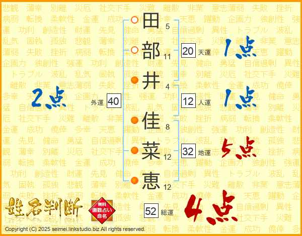 田(5画)部(11画)井(4画) 佳(8画)菜(12画)恵(12画)