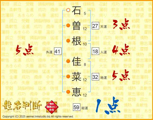 石(5画)曽(12画)根(10画) 佳(8画)菜(12画)恵(12画)
