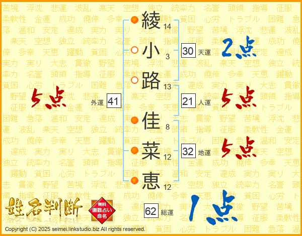 綾(14画)小(3画)路(13画) 佳(8画)菜(12画)恵(12画)