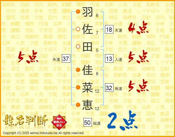 羽(6画)佐(7画)田(5画) 佳(8画)菜(12画)恵(12画)
