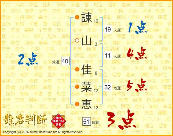 諌(16画)山(3画) 佳(8画)菜(12画)恵(12画)